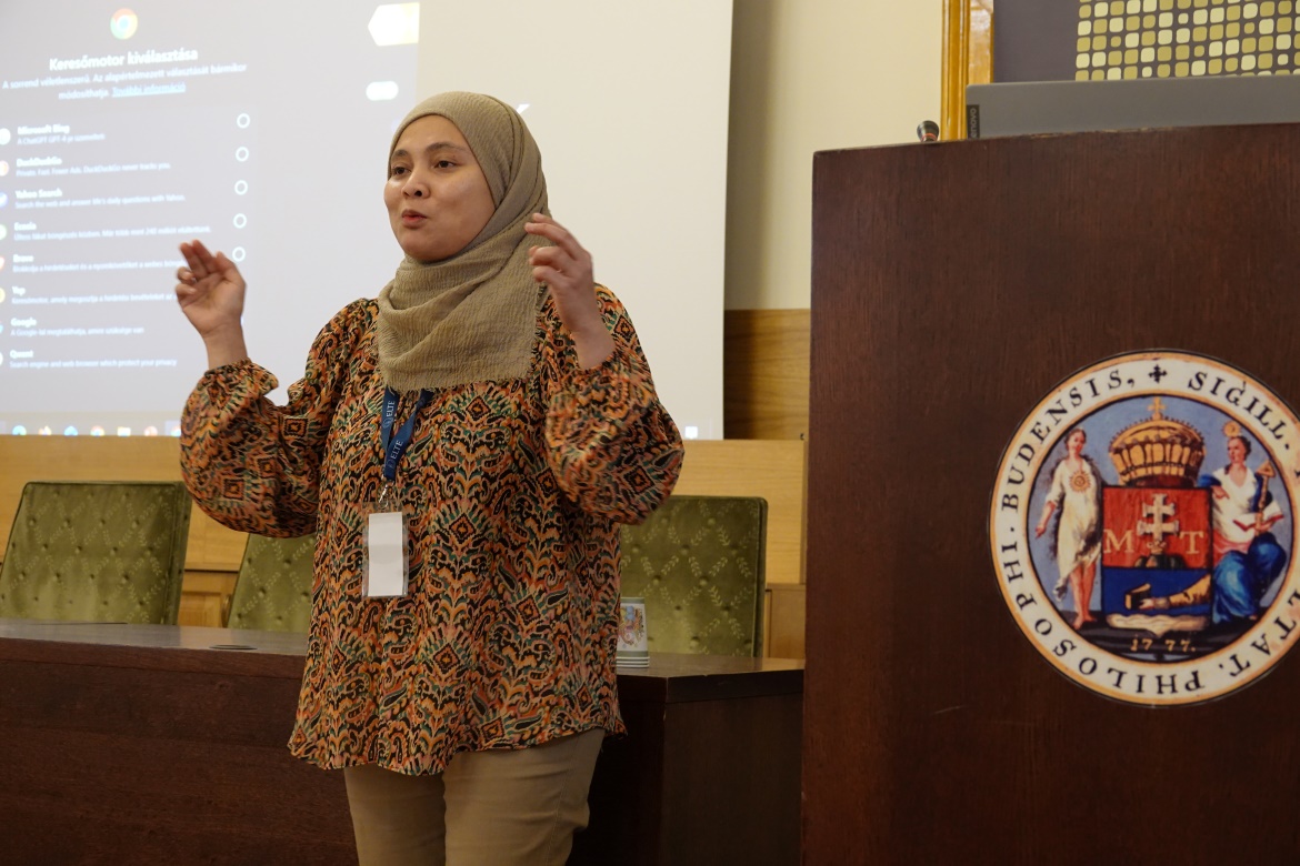 A délután a gyakorlati alkalmazásoké volt: Aurica Singeorzan történeti adatbázis-elemzést mutatott be, Majorszki Anita a mesterséges intelligencia által generált dalok pedagógiai potenciálját vizsgálta, míg Mezőfi Rebeka a ChatGPT nyelvtanulási hatékonyságát elemezte.